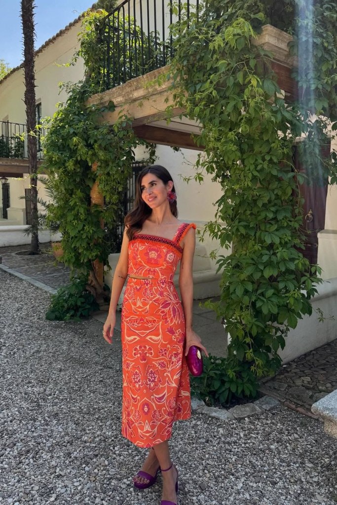 Aunque está disponible también en color turquesa, el conjunto Solera naranja, formado de topy falda, es un look vitamina con el que revitalizar cualquier estilismo de invitada, sumándose a la eterna tendencia del print floral y dando un extra de frescura a nuestra imagen.