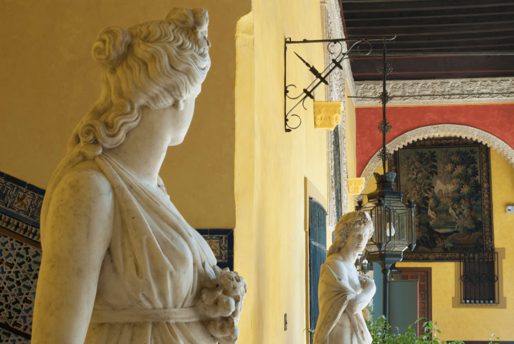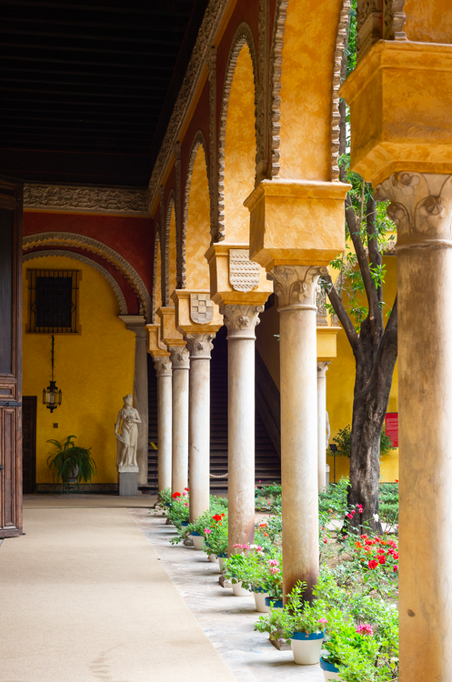 Construido entre los siglos XV y XVI, Palacio de Las Dueñas toma su nombre del desaparecido monasterio de Santa María de las Dueñas, ubicado en el solar colindante y demolido en 1868. Su origen fue la casa-palacio de los Pineda, señores de Casa Bermeja, que constituían uno de los linajes del patriciado de Sevilla. Sus miembros ejercieron importantes oficios como la escribanía mayor del cabildo de la ciudad y participaron en episodios bélicos de la Guerra de Granada. Posteriormente el Palacio fue heredado por don Fernando Enríquez de Ribera, II marqués de Villanueva del Río y padre de Antonia Enríquez de Ribera, casada en 1612 con Fernando Álvarez de Toledo, futuro VI duque de Alba. Desde esta fecha el palacio pertenece a la Casa de Alba.