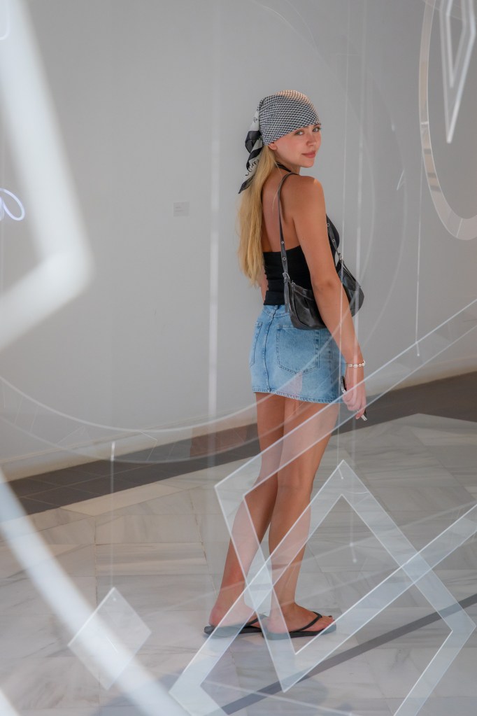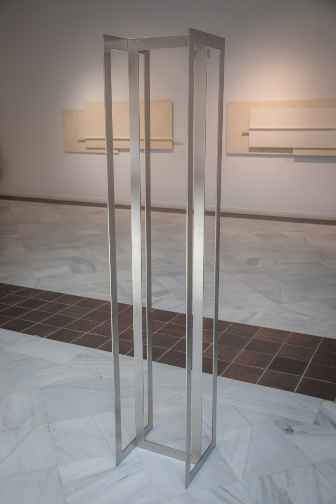 Y todo ello desde la utilización de materiales de muy diverso tipo (cobre, estaño, hierro, acero inoxidable, marfil, polvo de mármol, pintura sintética, cartón, etc.,) pero que hacen que el reflejo del concepto de pureza y sencillez gravite siempre sobre las líneas rectas, las cuales parecen perderse en el espacio como si el tamaño de la obra no tuviera límite.
