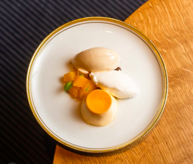 Entre los postres, destaca el Pijama, un flan de huevo cremoso con melocotón confitado y helado de banoffee, un plato que se concibió en la playa de la Barceloneta a mediados de siglo por petición de marineros extranjeros que pedían el postre “Peche Malba”, que derivó por fonética en “Pijama”, resaltando una vez la potente conexión de la cocina de Zafra con Barcelona.