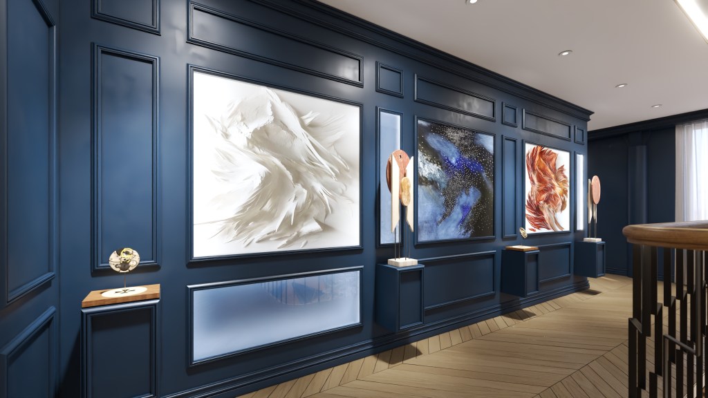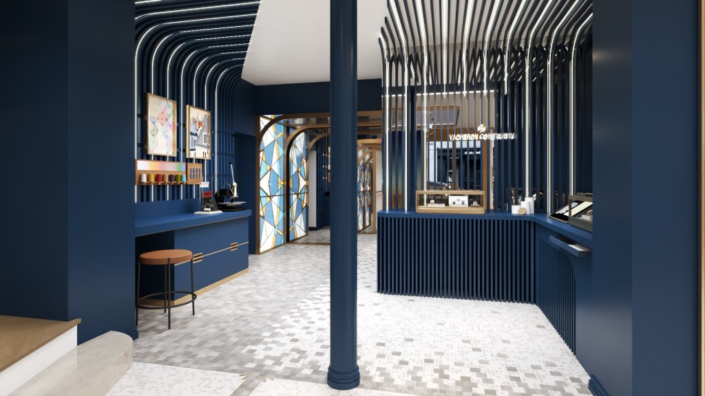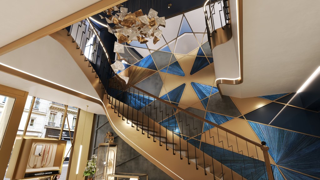 Los interiores, que incorporan materiales nobles, colores cálidos y artes decorativas francesas, como las vidrieras y la marquetería de paja, se han diseñado con un espíritu acogedor, tanto en el espacio de estilo brasserie parisina de la planta baja como en la planta superior, donde los visitantes privilegiados son recibidos en los salones íntimos o en el comedor privado. La escalera evoca la forma de la Cruz de Malta, emblema de Vacheron Constantin desde 1880, que se inspiró en la forma de un componente de los primeros movimientos relojeros dedicado al isocronismo mejorado del muelle.