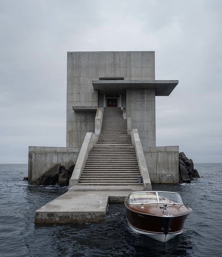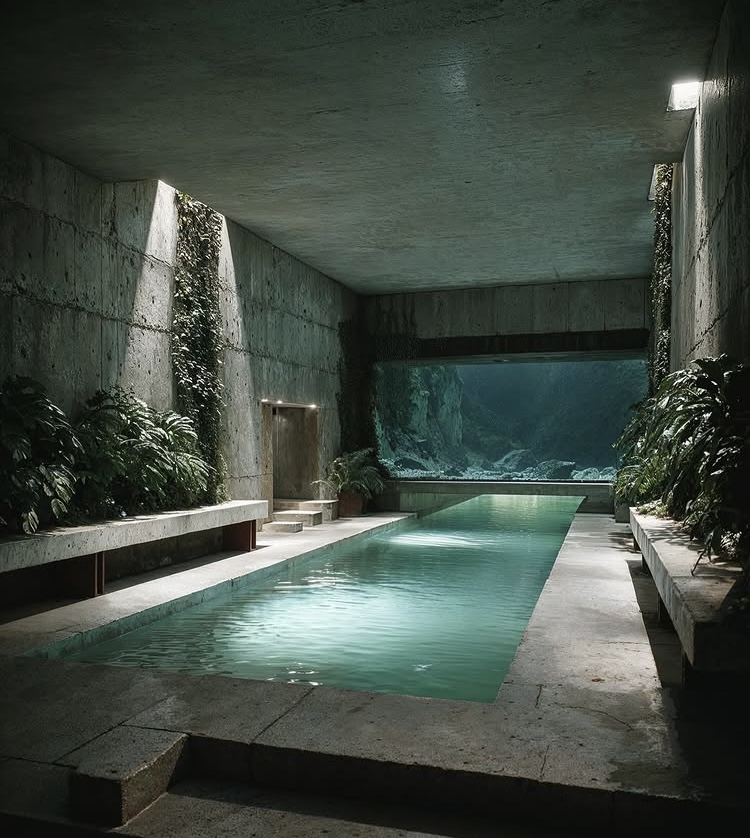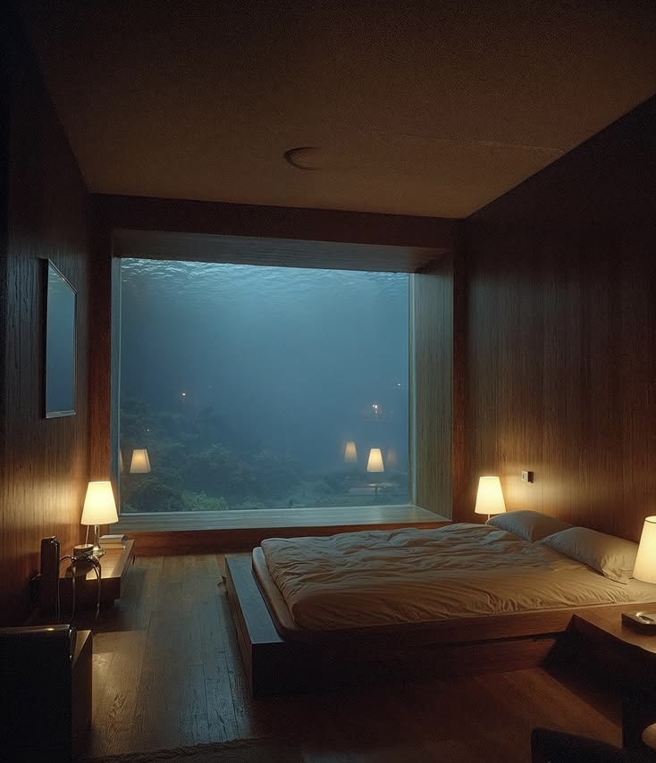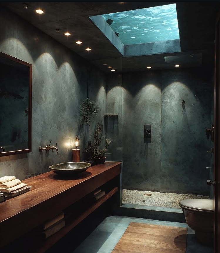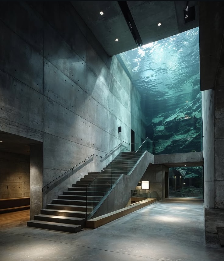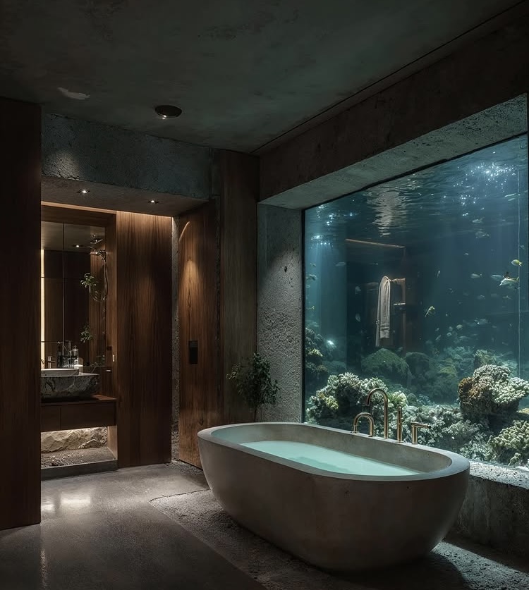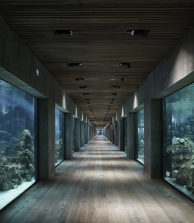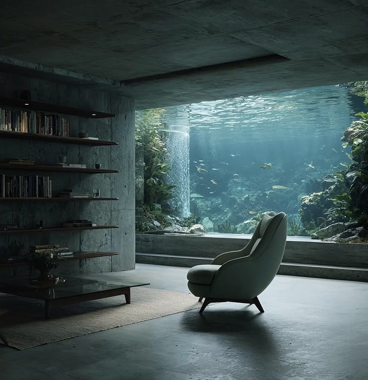 Un loft de estilo brutalista-moderno sumergido en las profundidades tropicales. El cristal de suelo a techo revela jardines de coral y peces que nadan; la luz dorada del mediodía se refleja en el hormigón visto y las vigas de teca. Un espacio de conversación hundido de terciopelo azul marino se encuentra frente al espectáculo acuático, mientras que un dormitorio minimalista y un baño de cristal combinan texturas orgánicas con una tranquilidad surrealista.