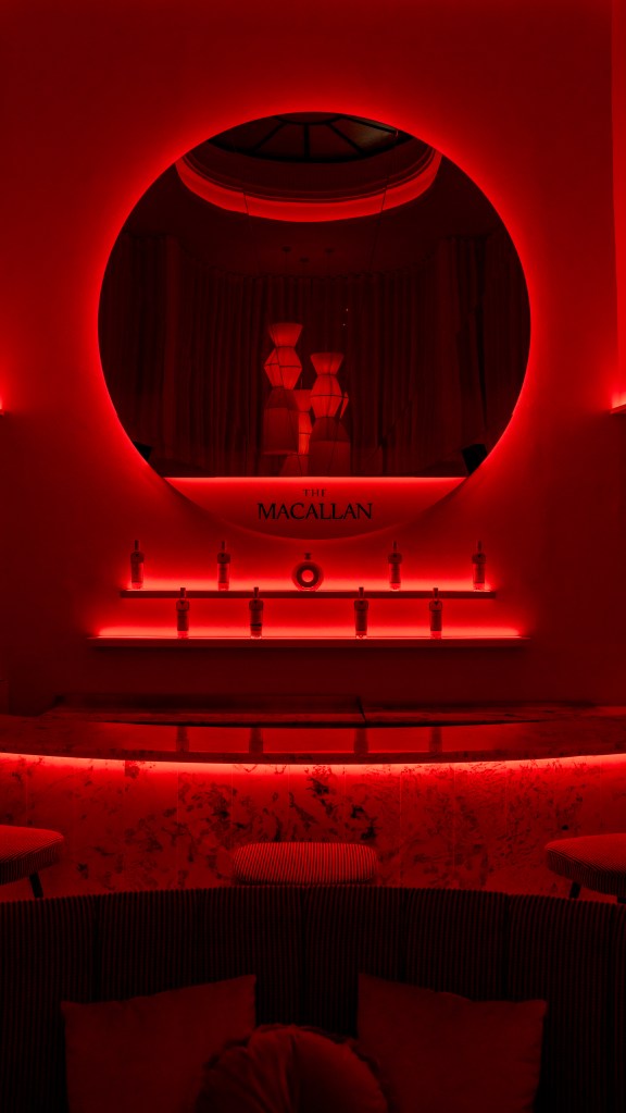 Una impresionante barra de mármol gobierna el local. Como si de un altar retroiluminado se tratase, The Macallan se alza como una escultura enmarcada por un profundo espejo circular.