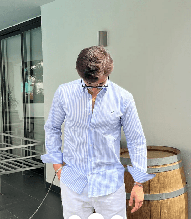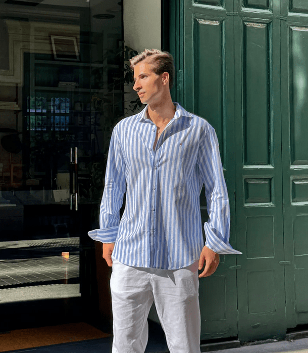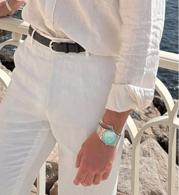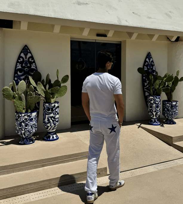La colección se desplegó allí como quien tiende sábanas al sol. Pantalones blancos de lino con dos estrellas azules bordadas (¿guiño celestial o gesto amoroso?), camisas amplias como abrazos frescos y complementos para ese chico que no necesita subrayarse. Todo respira un verano sin postureo, con piel, con pausa. El de los días largos y los mensajes cortos. El de la siesta bien ganada.