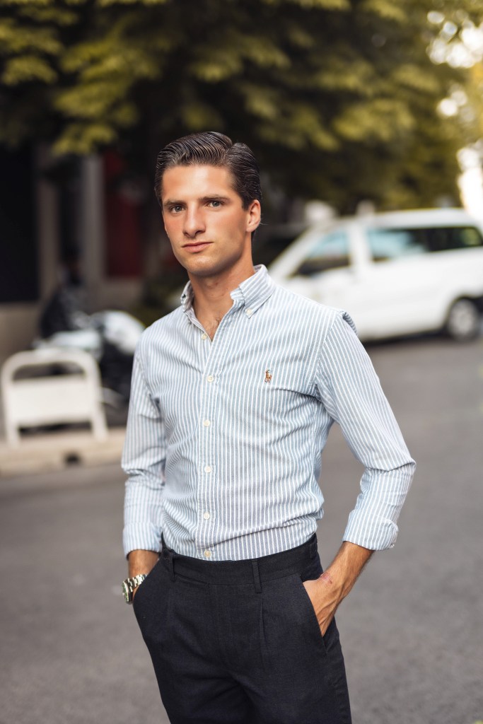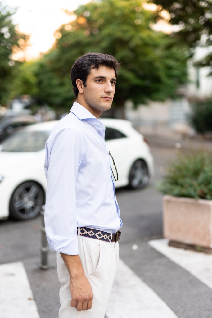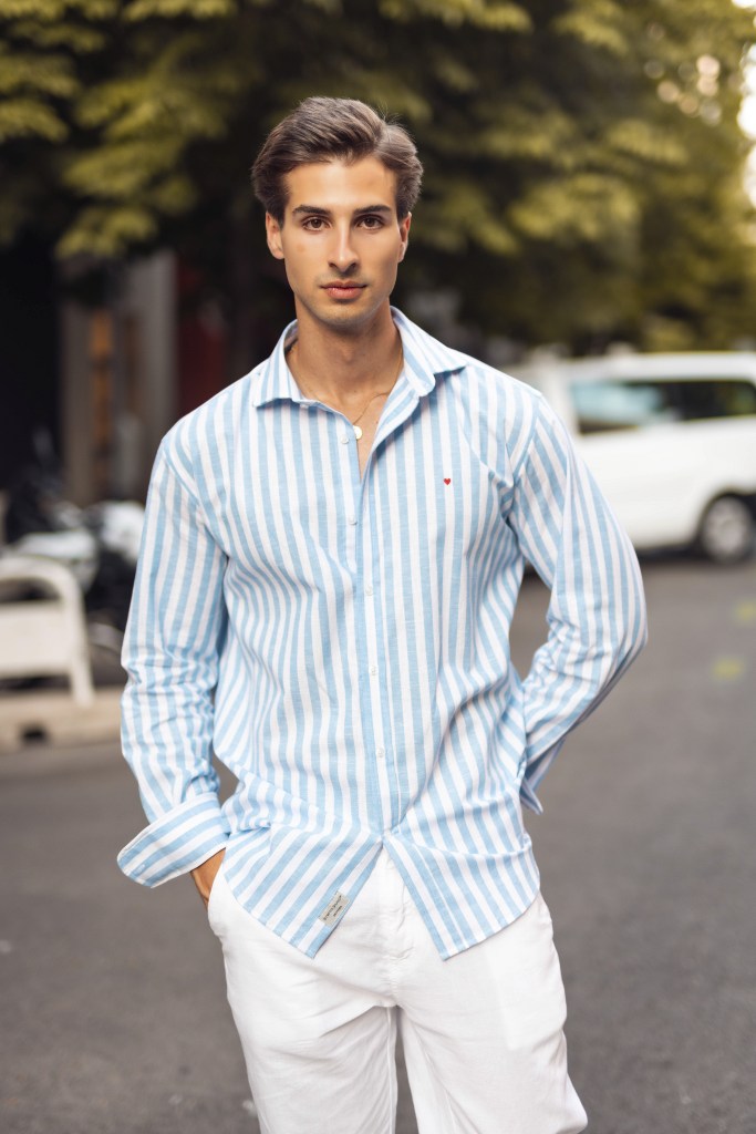 La propuesta es sencilla pero cargada de intención: pantalones blancos de lino con dos estrellas azules bordadas, como si alguien hubiera atrapado un trozo de cielo y lo hubiese cosido justo donde nace la zancada. Camisas amplias, también de lino, como recién planchadas por el viento del sur. Y complementos pensados para él, pero que bien podría llevar cualquiera que ame lo ligero, lo fresco, lo bien hecho sin afectación.