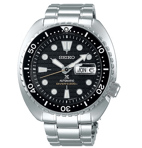 Para los seguidores de Seiko, el Turtle evoca una imagen clara e inmediata: su caja ovalada, semejante al caparazón de una tortuga, es ya un icono. Fabricado en acero inoxidable y con un diámetro que ronda los 44.3 milímetros —e incluso 45 en su versión “King Turtle”—, su diseño equilibra presencia y comodidad gracias a unas asas cortas que evitan la sensación de volumen excesivo.
