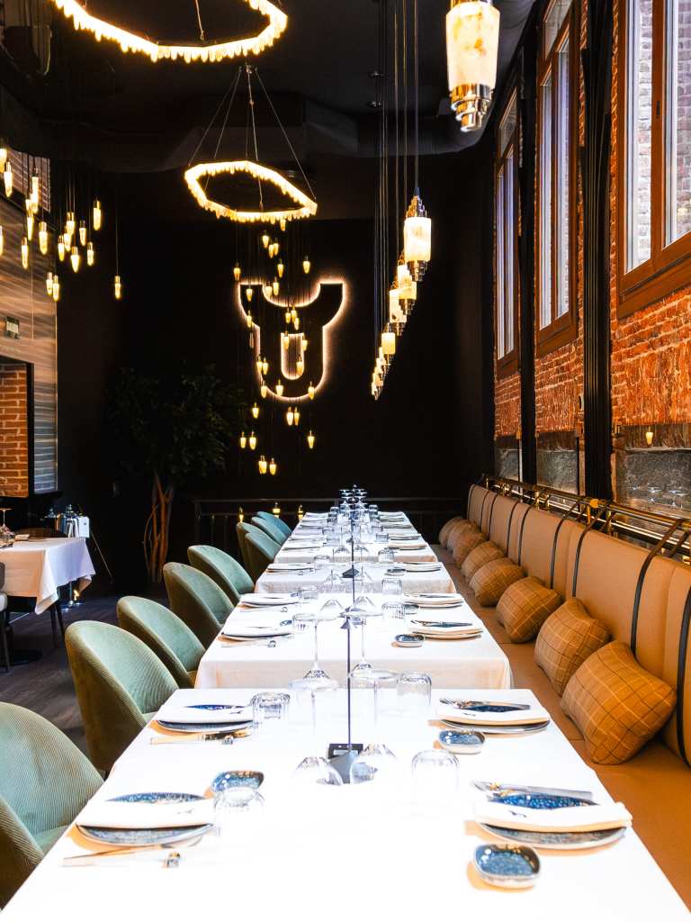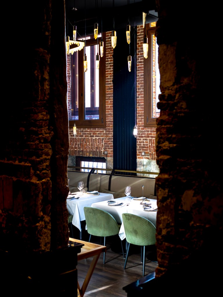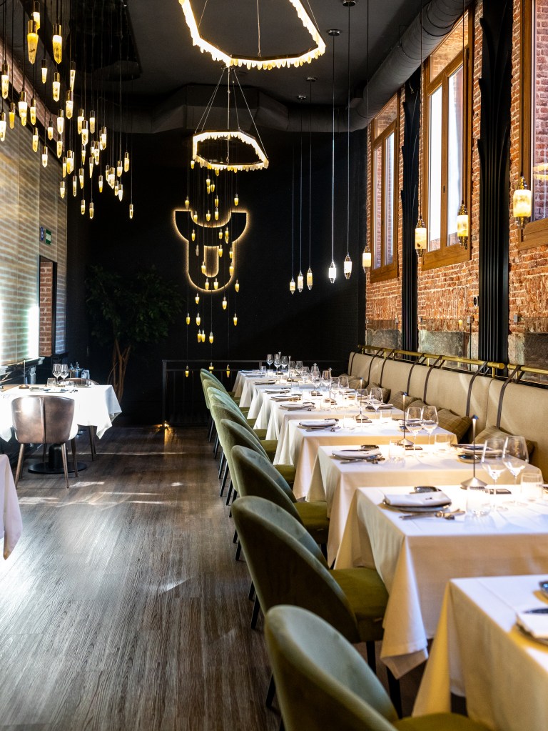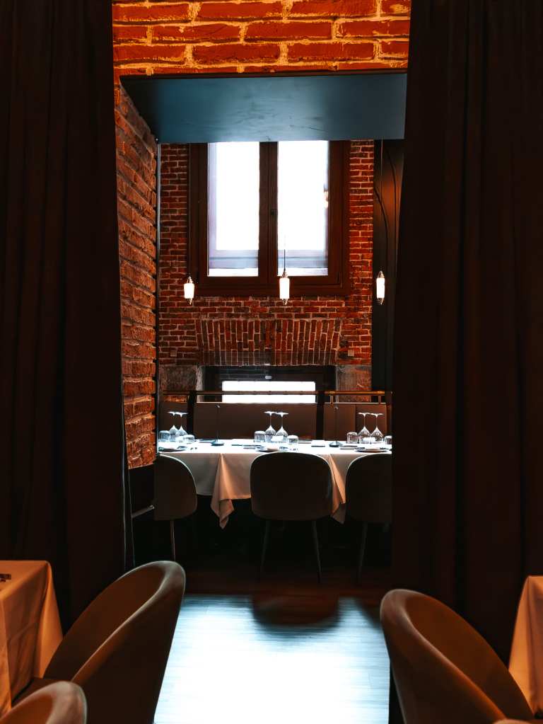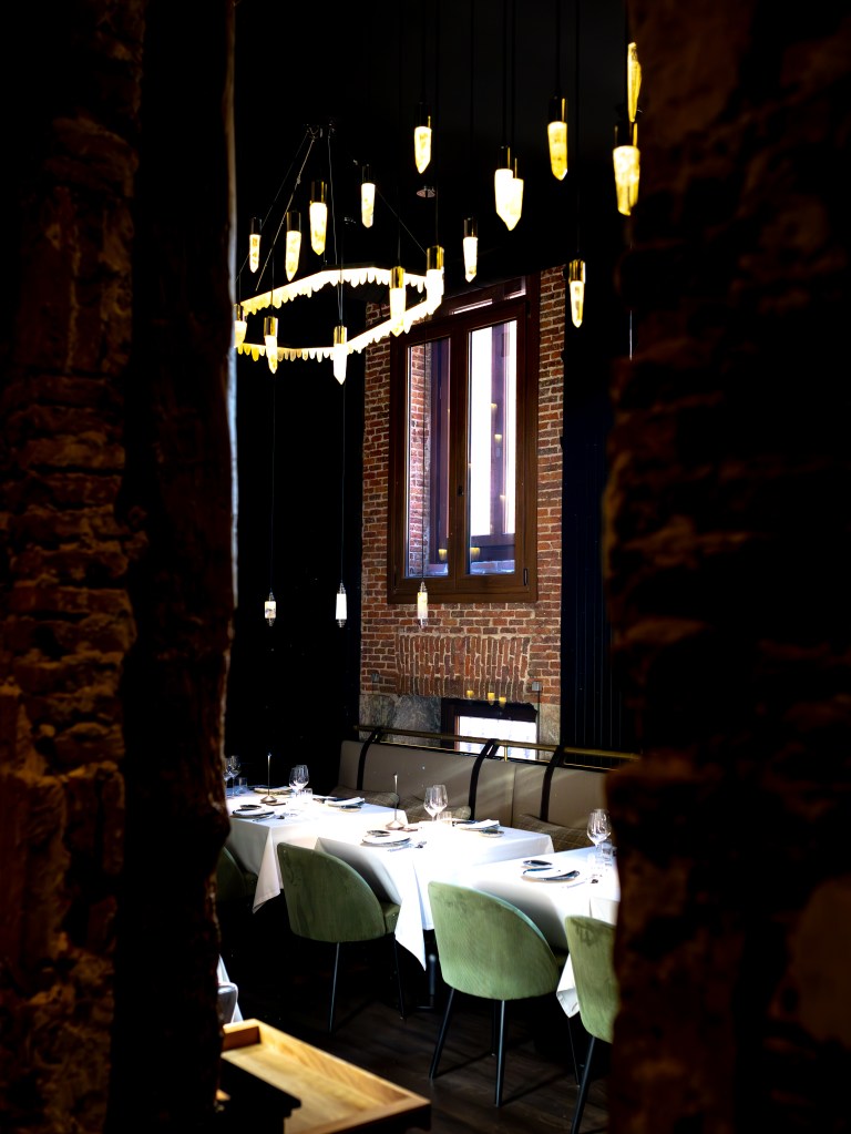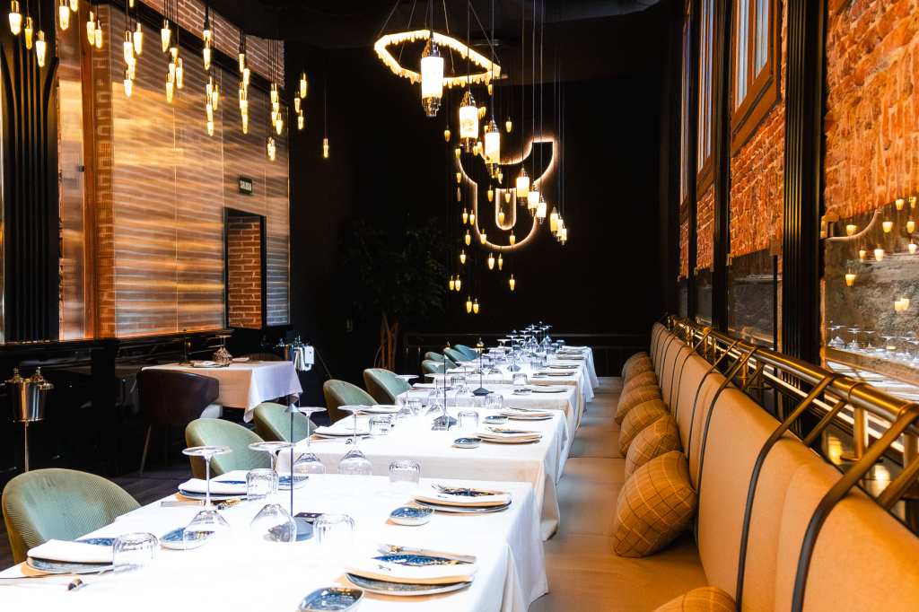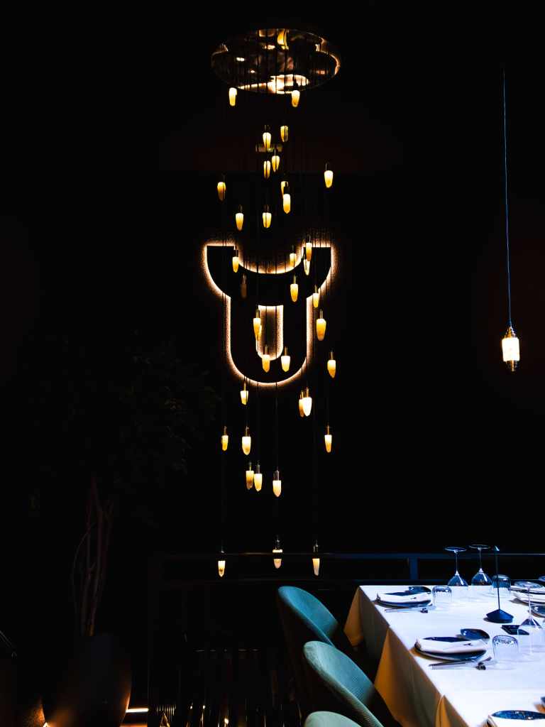 clave del diseño. A medida que se avanza en el recorrido, el diseño lumínico guía el espacio: luces tenues, cálidas y estratégicamente colocadas revelan cada rincón, creando un ambiente acogedor y envolvente. Además, las paredes del restaurante están adornadas con