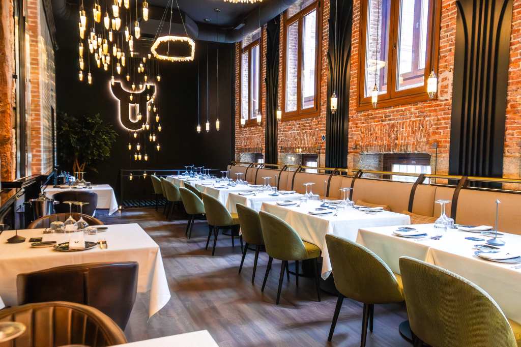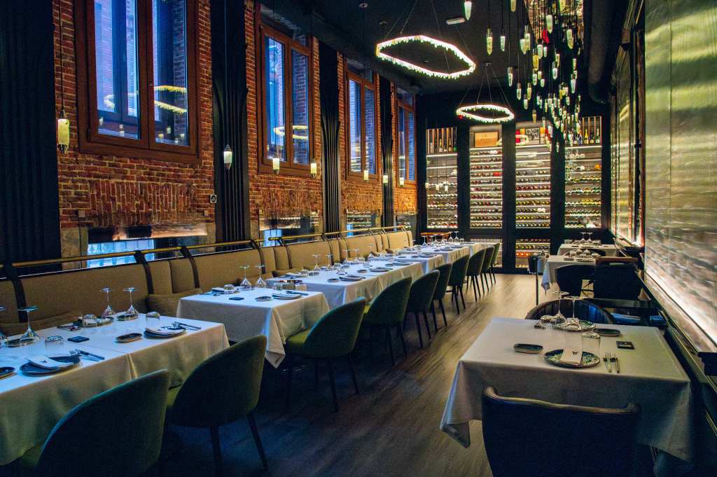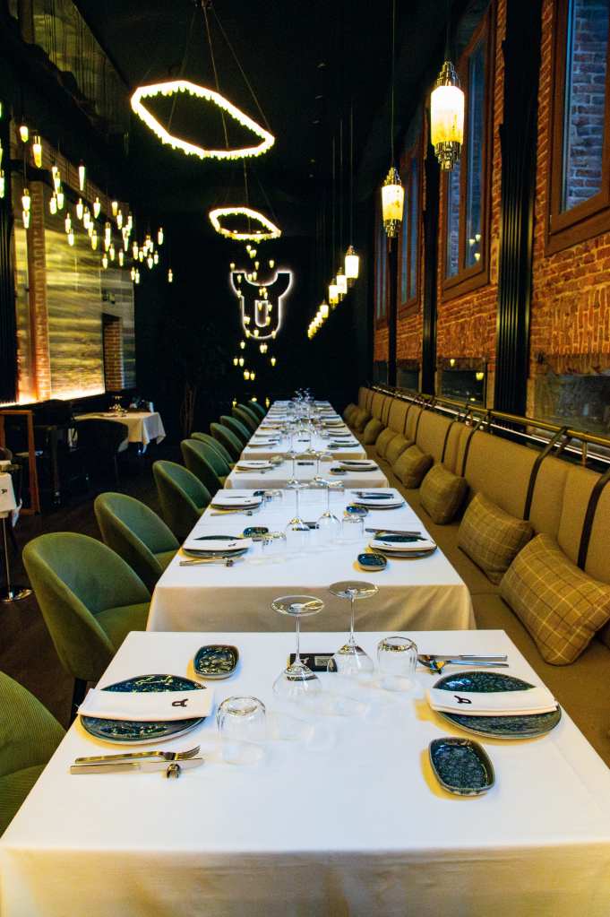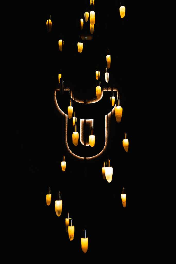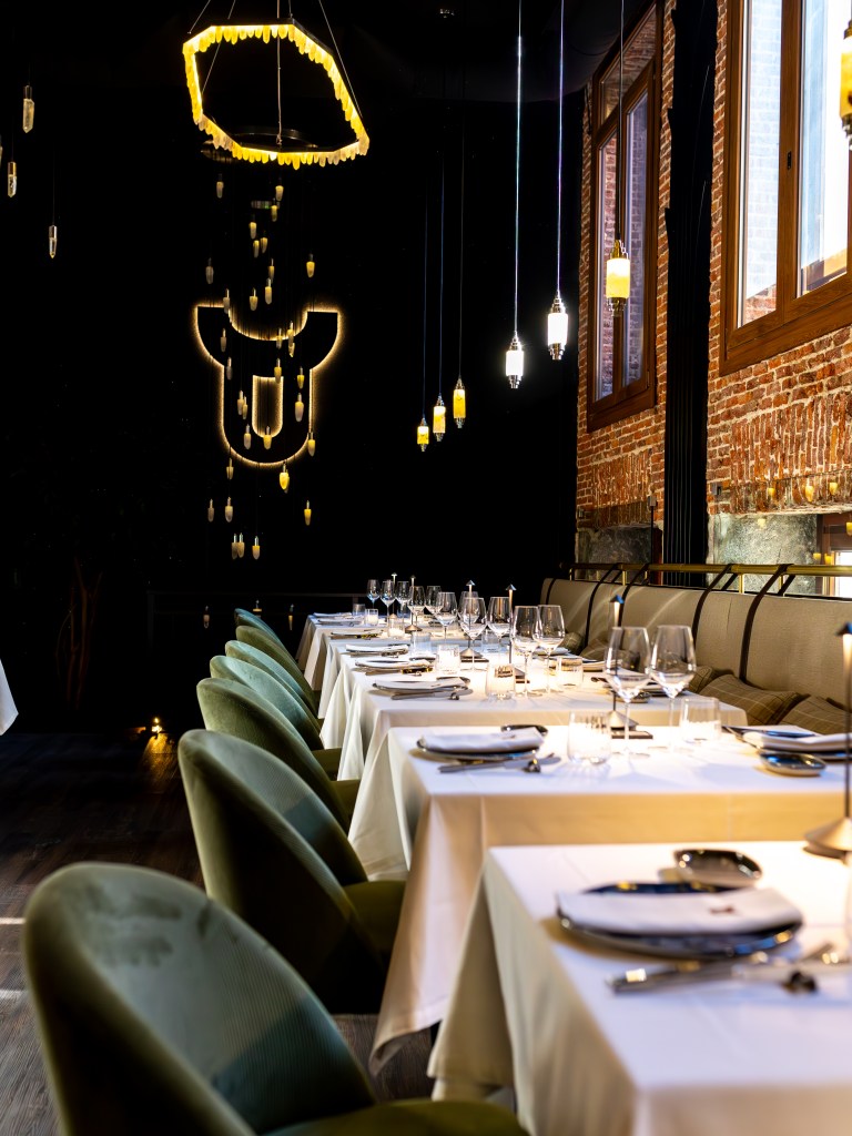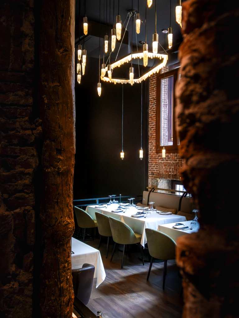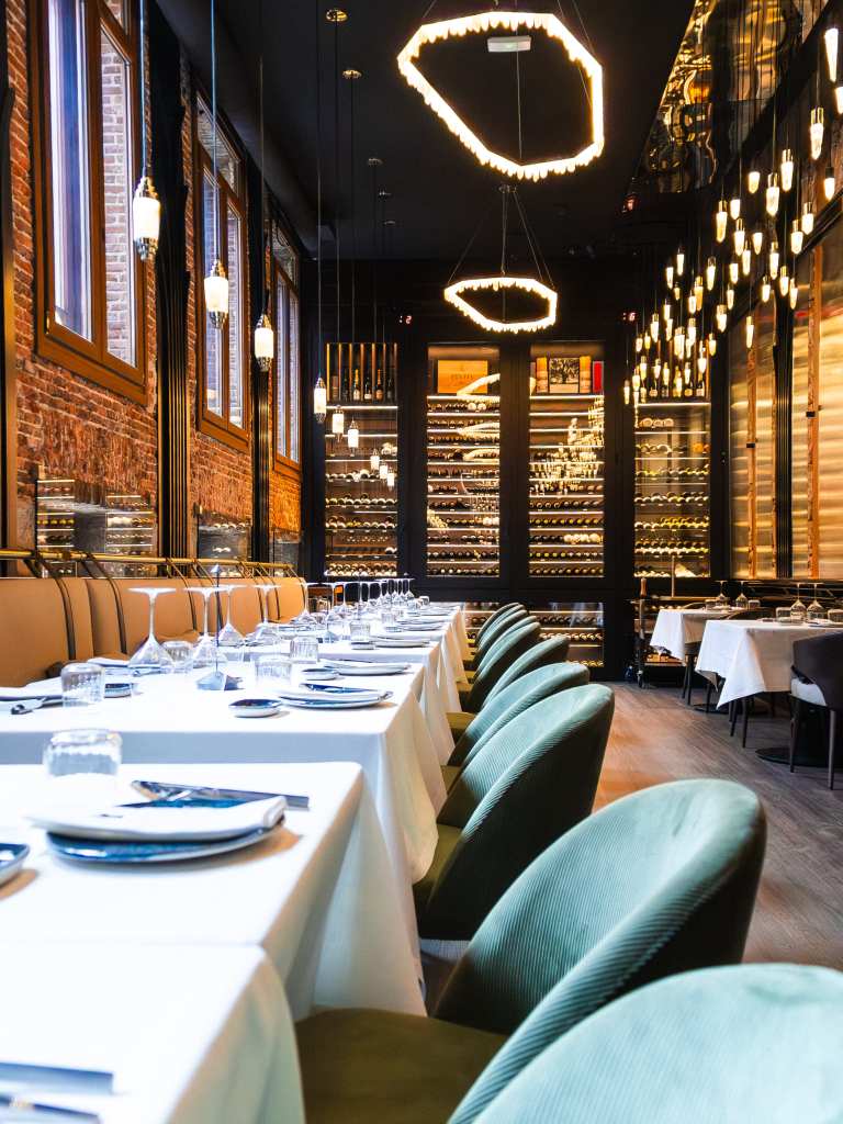 clave del diseño. A medida que se avanza en el recorrido, el diseño lumínico guía el espacio: luces tenues, cálidas y estratégicamente colocadas revelan cada rincón, creando un ambiente acogedor y envolvente. Además, las paredes del restaurante están adornadas con