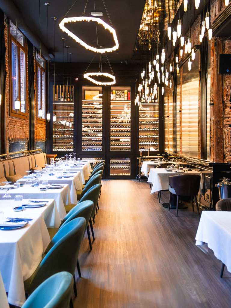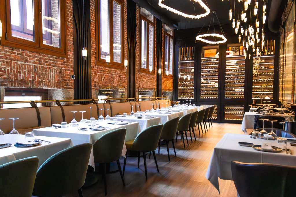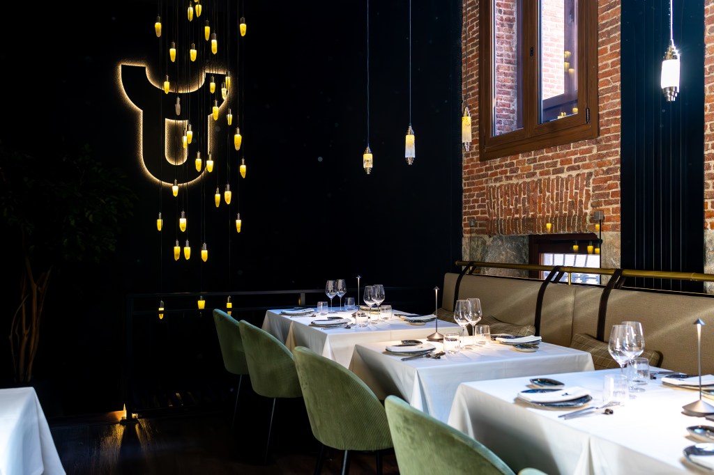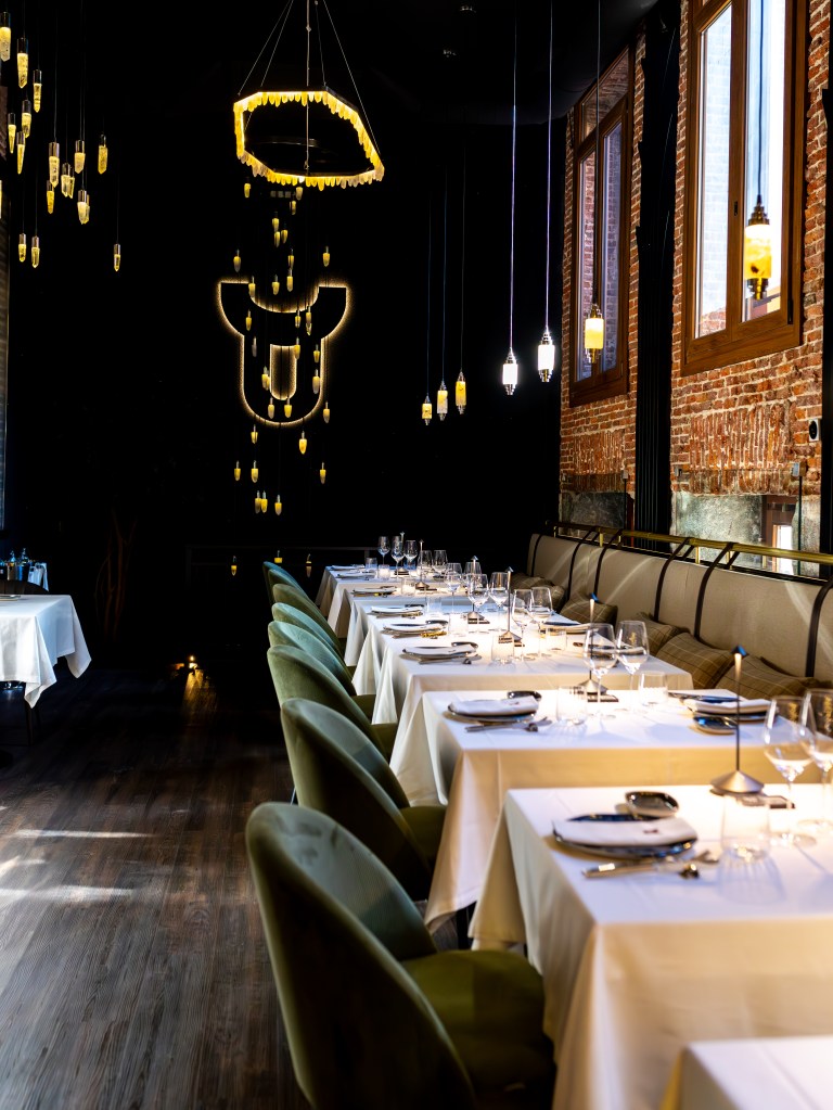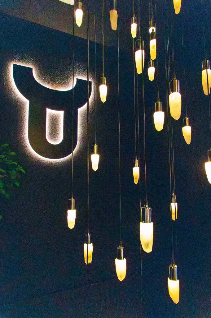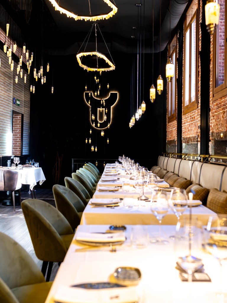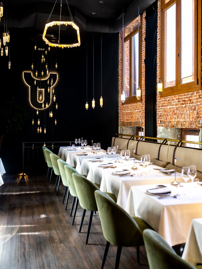 clave del diseño. A medida que se avanza en el recorrido, el diseño lumínico guía el espacio: luces tenues, cálidas y estratégicamente colocadas revelan cada rincón, creando un ambiente acogedor y envolvente. Además, las paredes del restaurante están adornadas con