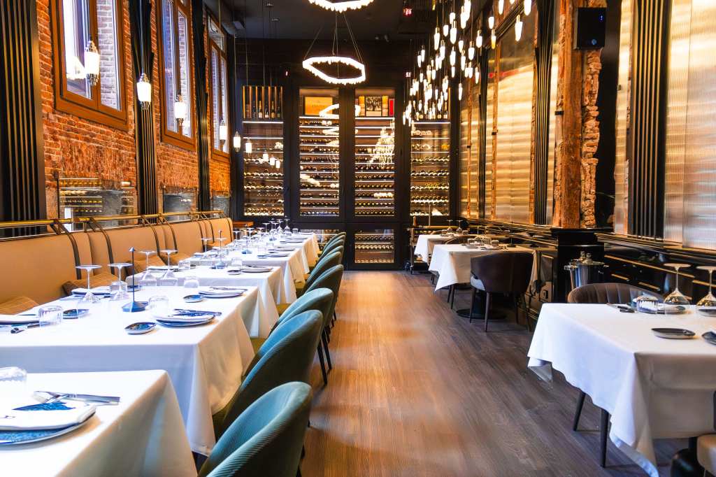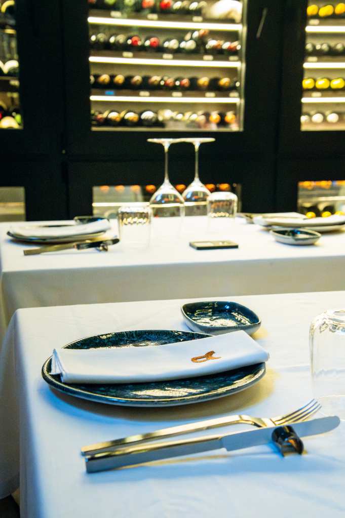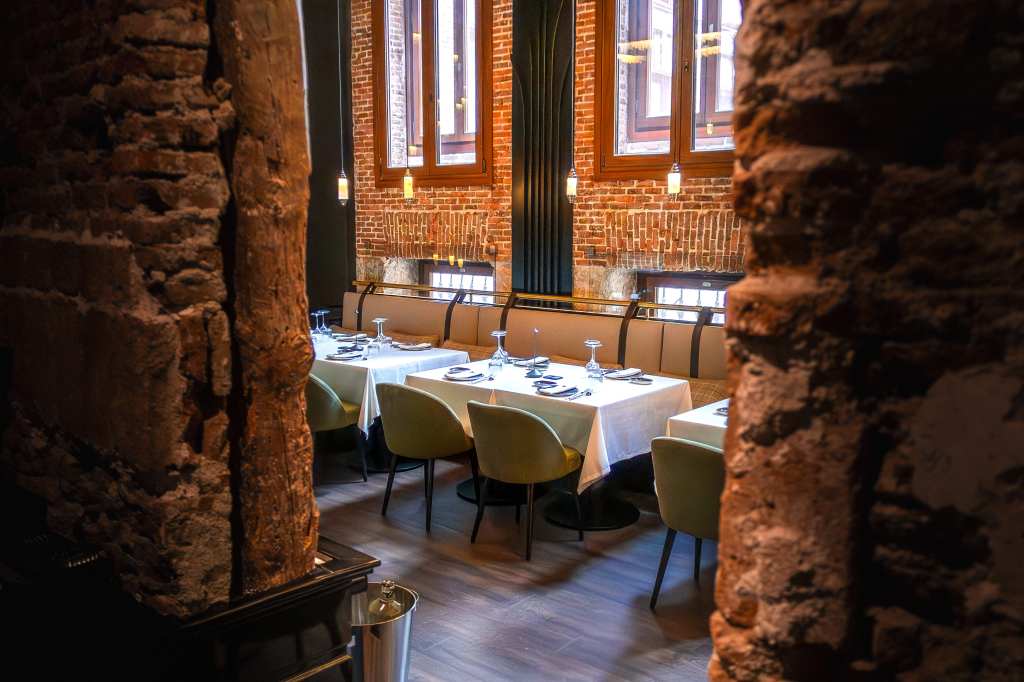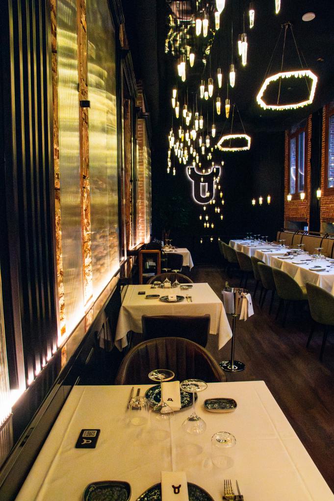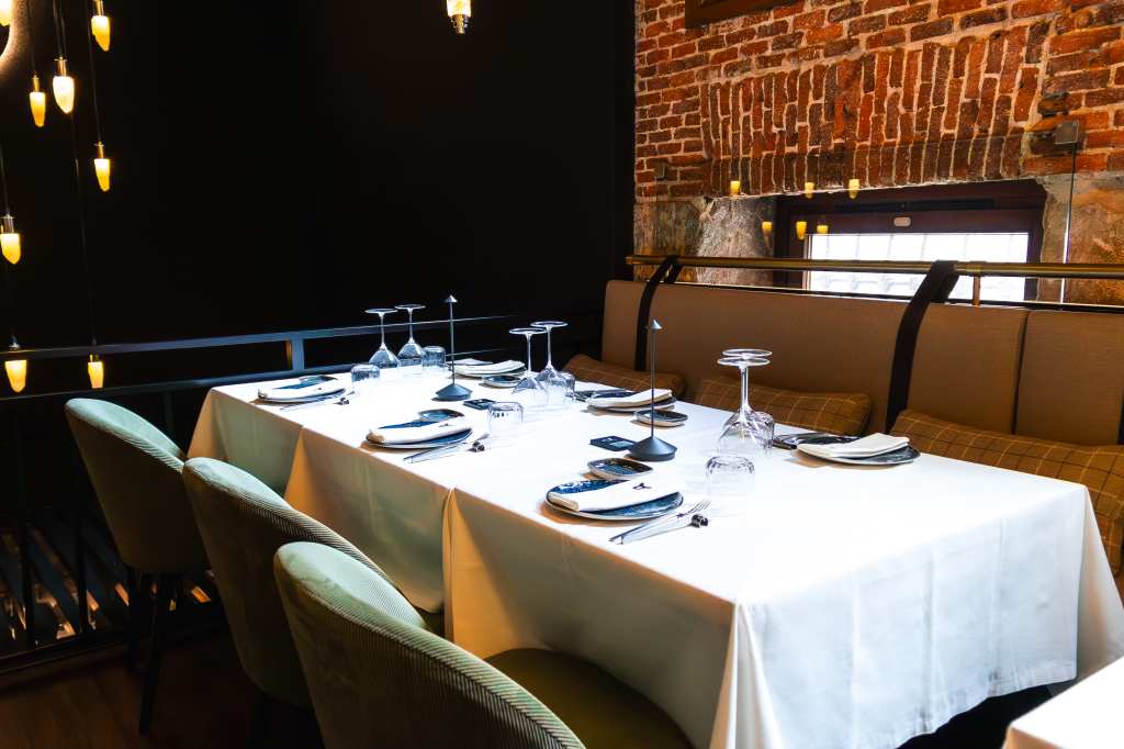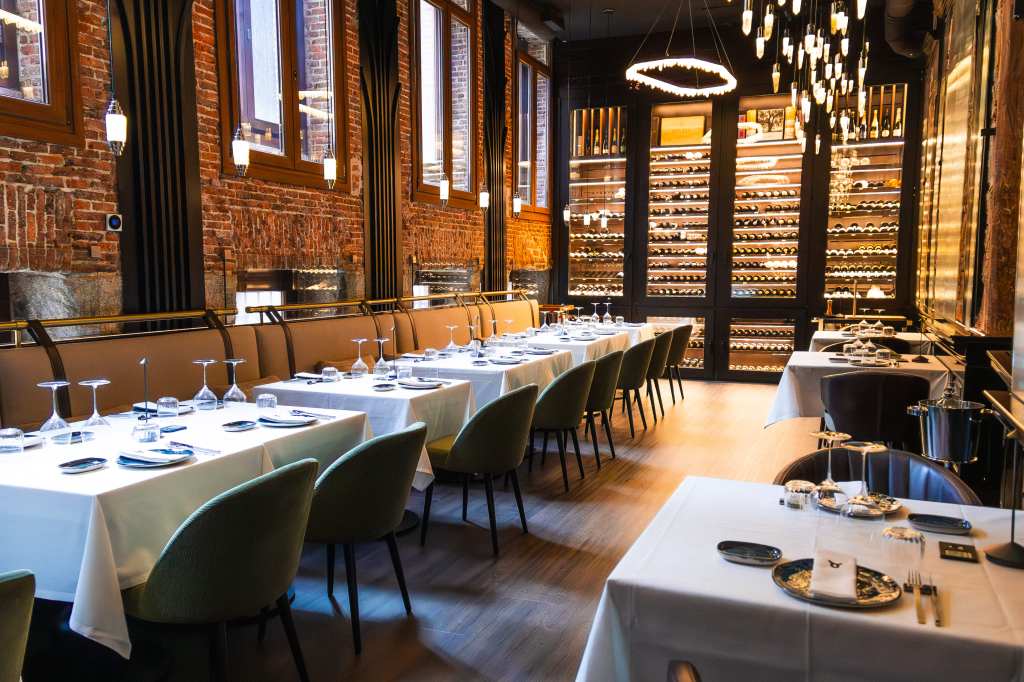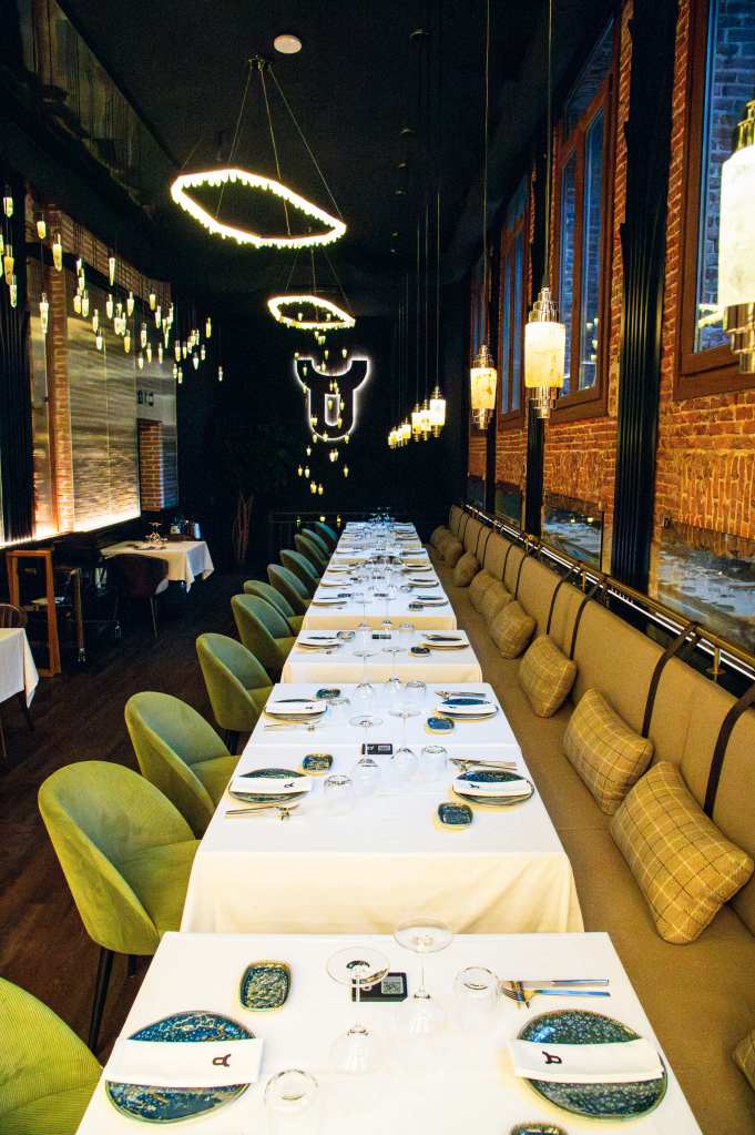 clave del diseño. A medida que se avanza en el recorrido, el diseño lumínico guía el espacio: luces tenues, cálidas y estratégicamente colocadas revelan cada rincón, creando un ambiente acogedor y envolvente. Además, las paredes del restaurante están adornadas con