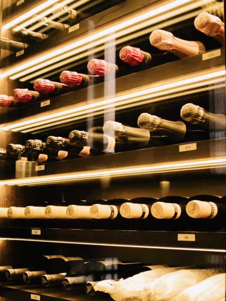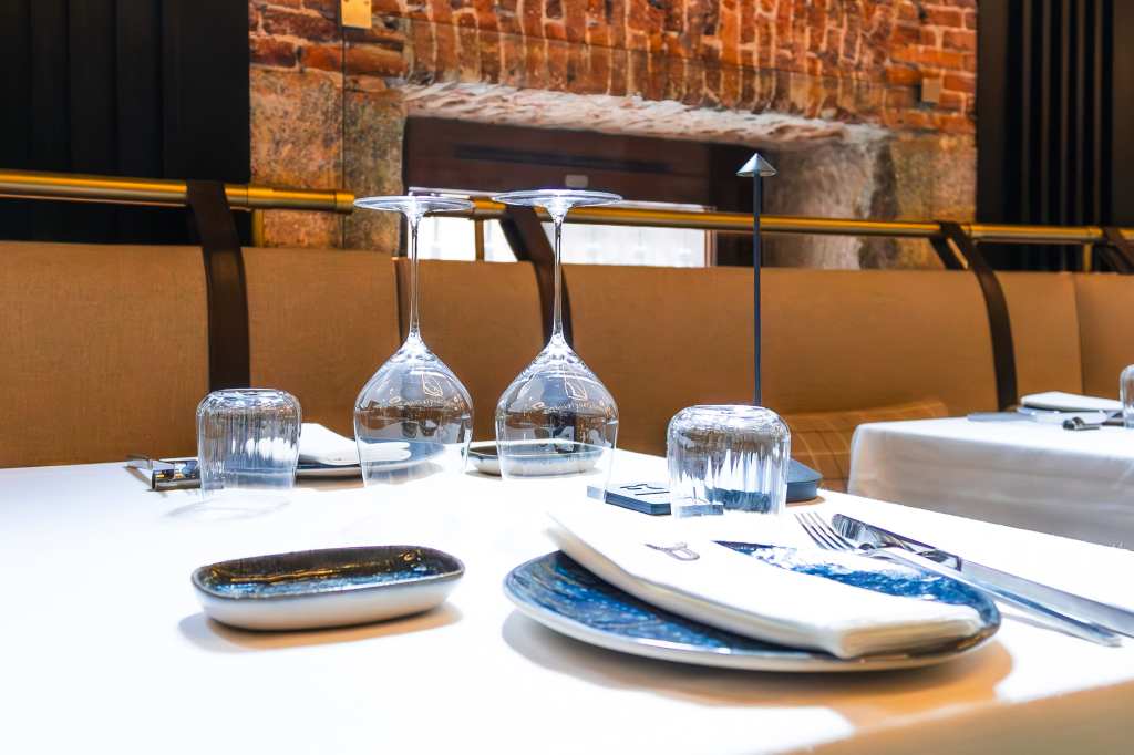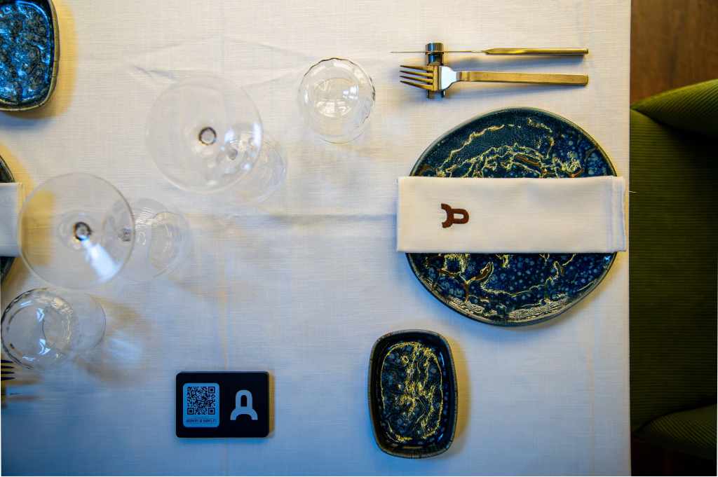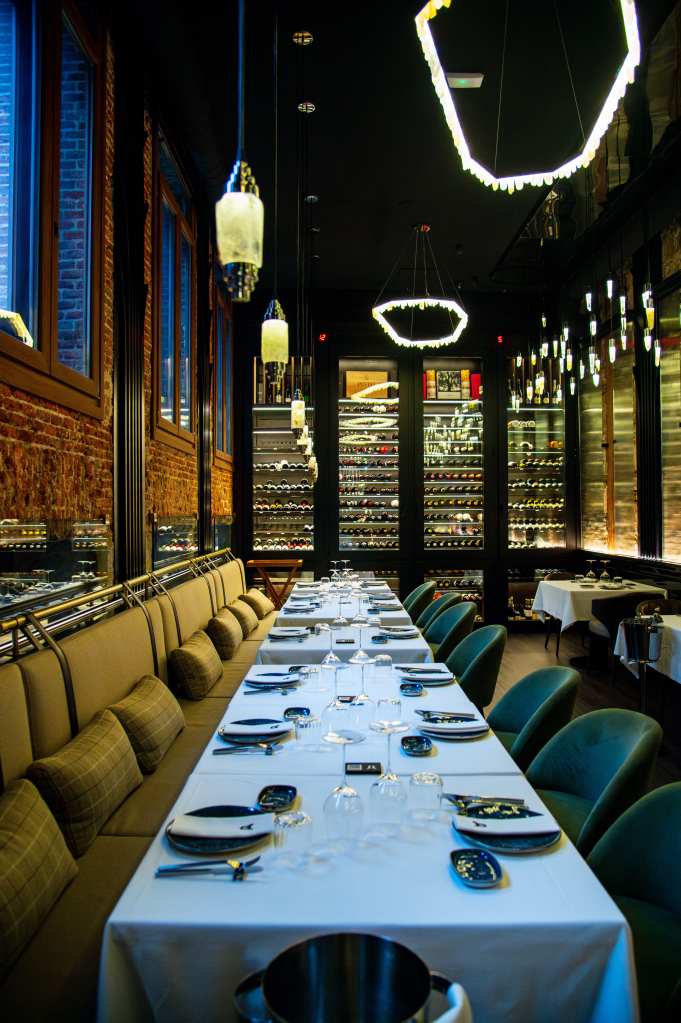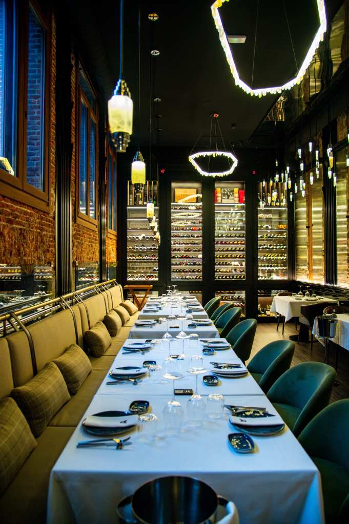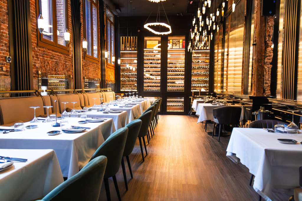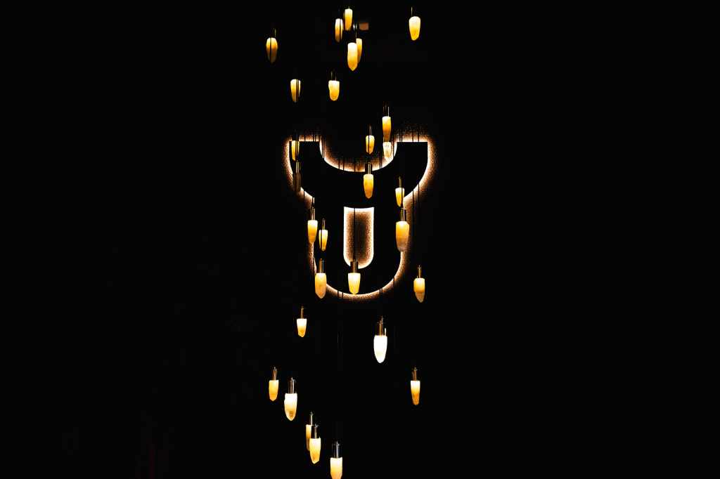 clave del diseño. A medida que se avanza en el recorrido, el diseño lumínico guía el espacio: luces tenues, cálidas y estratégicamente colocadas revelan cada rincón, creando un ambiente acogedor y envolvente. Además, las paredes del restaurante están adornadas con
