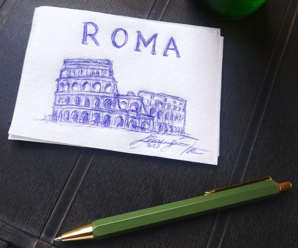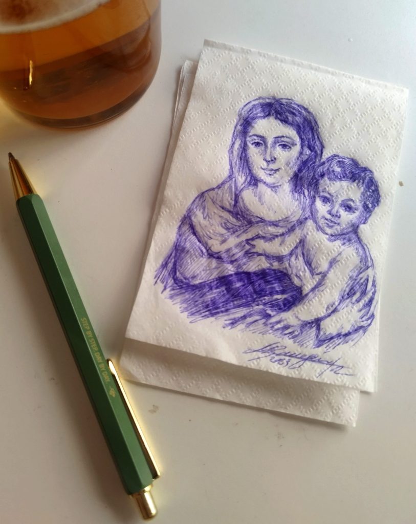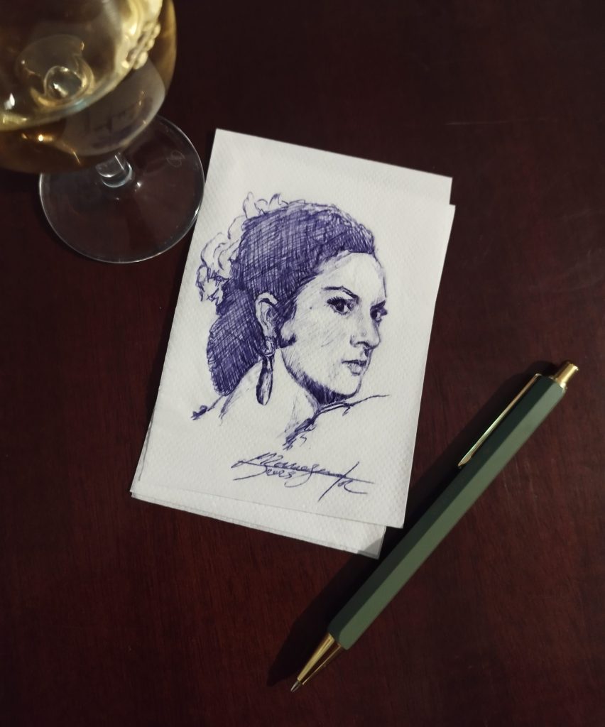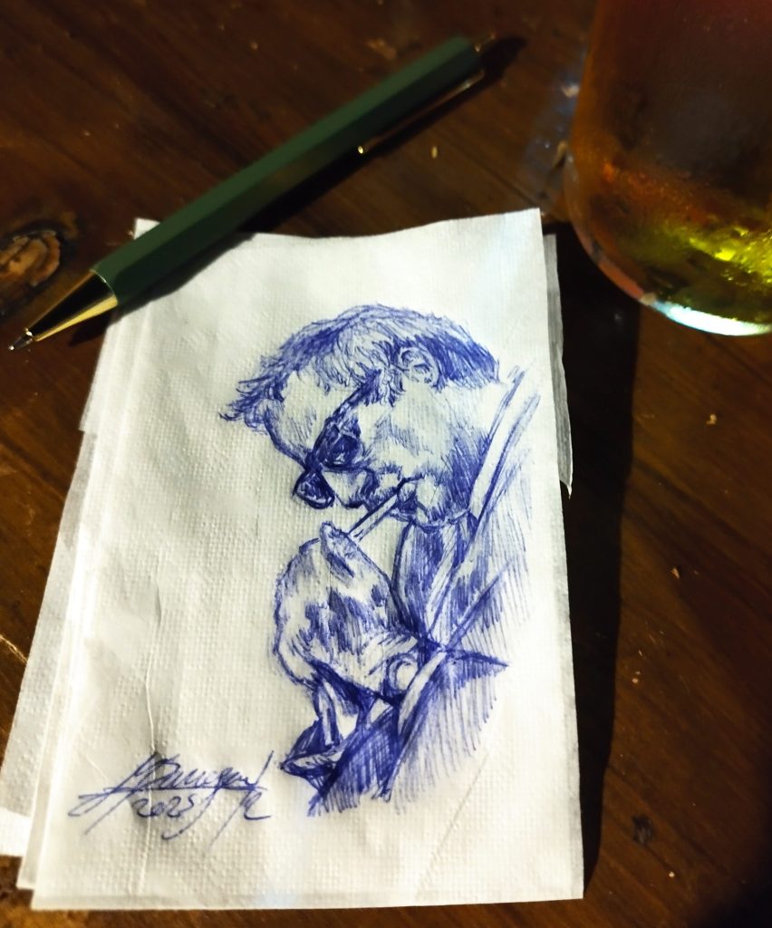 RESPUESTA: Y una buena compañía. Lo de las servilletas es algo que llevo haciendo toda la vida. De pequeño, cuando mis padres me veían aburrido en un bar, en lugar de darme el móvil me daban un bolígrafo y una servilleta para entretenerme dibujando. Ya de mayor, aprovecho los ratitos de cervezas con mis amigos para sorprenderlos con un dibujo y que se lleven un recuerdo de ese momento juntos.