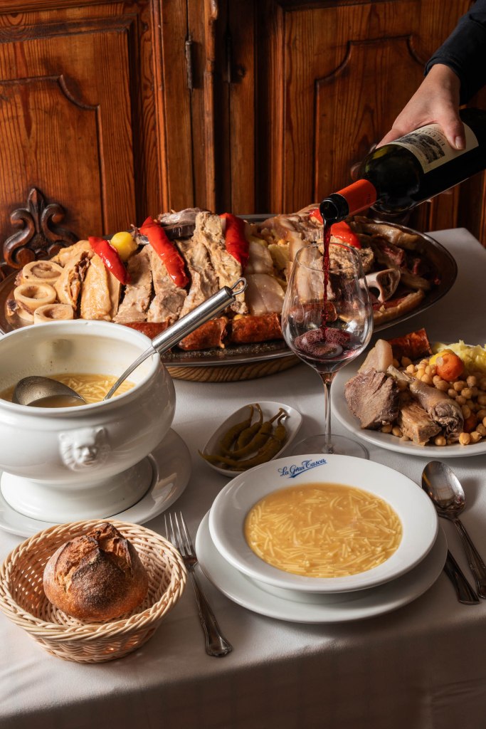 El cocido aquí no se improvisa. Se caligrafía. La sopa burbujea durante dos días, desgrasada, reducida, concentrada, como un ensayo de invierno hasta lograr un caldo con densidad, alma y luz. La sopera queda en la mesa —detalle que enamora— como si dijeran: sírvanse sin pudor, que aquí nadie vigila las repeticiones.