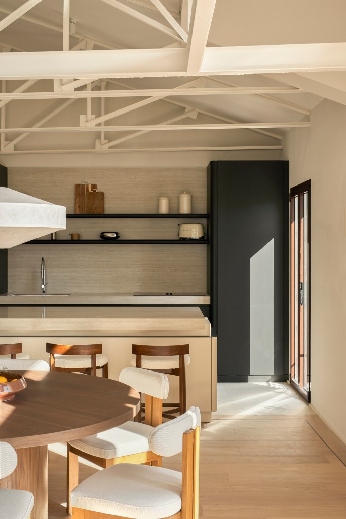 La vivienda se articula en torno a un gran espacio común con cocina abierta, concebido como el corazón social del ático. Los ventanales inundan el interior de luz natural, que se transforma a lo largo del día creando juegos de sombras y reflejos. Las vigas originales recorren el espacio y, en el salón, organizan el conjunto bajo la cúpula que remata el edificio. Aquí, la disposición circular del mobiliario y las líneas curvas favorecen una atmósfera fluida y acogedora, presidida por una chimenea contemporánea de inspiración art déco revestida en mármol Verde Alpi. La cocina se integra como una prolongación del panelado, con una isla escultórica de travertino de volúmenes superpuestos y detalles en hierro negro, donde los cantos redondeados refuerzan el lenguaje arquitectónico del proyecto.