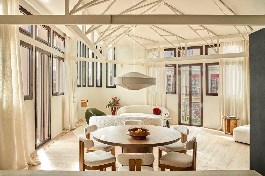 Bajo la dirección de Abel Pérez Gabucio, fundador de ÀBAG, el estudio afronta el reto de adaptar el interior a la compleja geometría del edificio, exaltando su planta triangular y las vigas originales vistas. Desde la entrada, un pasillo definido por una pared estucada de trazo vertical y un panelado de roble oscuro marca el tono del conjunto. El suelo de roble natural blanqueado, dispuesto en espiga y enmarcado en el perímetro, conecta con la tradición del edificio, mientras la estructura del techo queda expuesta y se acompaña de un plano continuo que introduce un sutil acento contemporáneo de inspiración industrial.