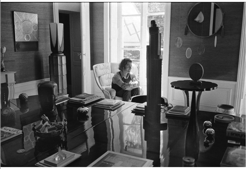 En París, su apartamento del Quai Voltaire fue quizá el más célebre. Un espacio radicalmente blanco, casi quirúrgico, donde desaparecía cualquier rastro de ornamento innecesario. Paredes desnudas, líneas puras, ausencia deliberada de sentimentalismo. Allí, el blanco no era neutral: era una declaración. Una forma de borrar el ruido del mundo para dejar hablar a las ideas. Frente a esa asepsia visual, sus bibliotecas —siempre monumentales— introducían el contrapunto: miles de libros ordenados horizontalmente, no por descuido, sino por convicción estética. El libro como objeto gráfico, no solo como contenido.